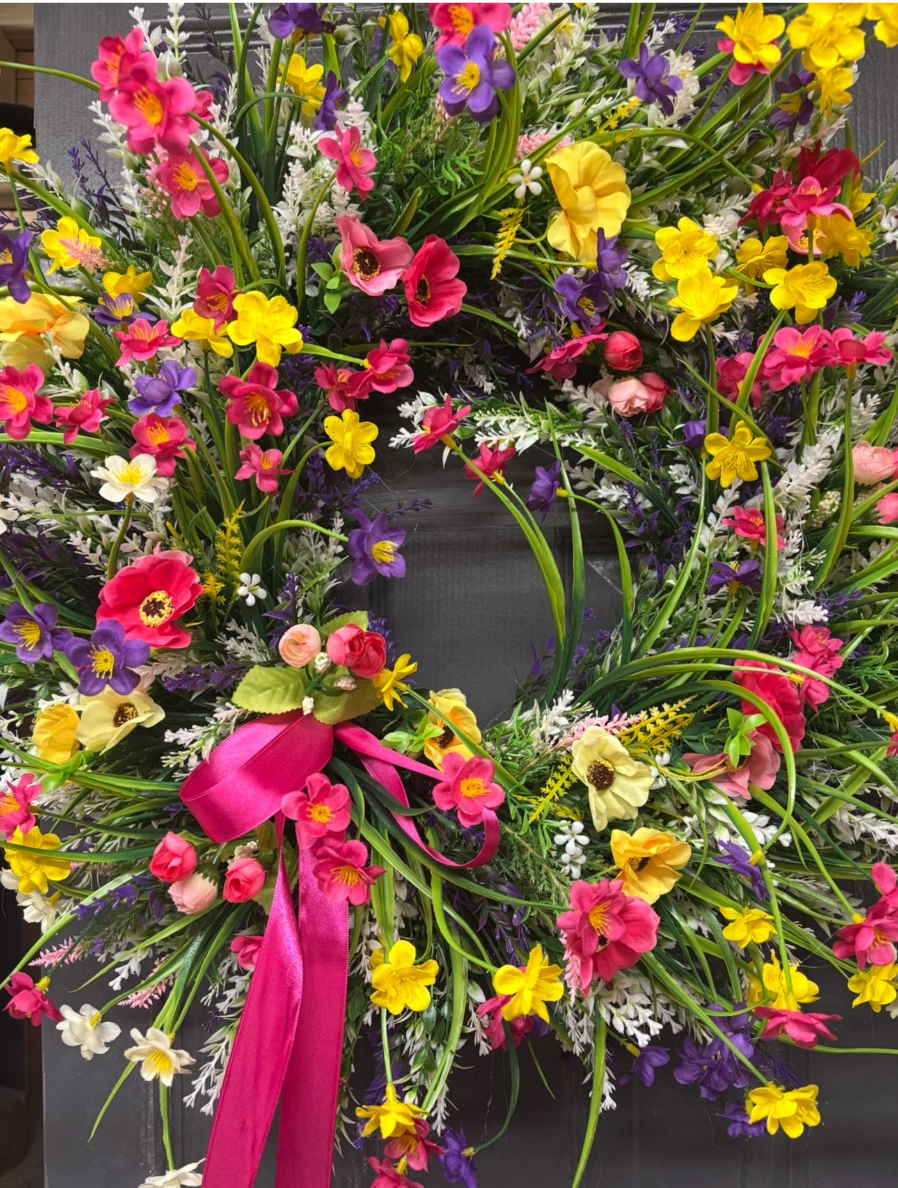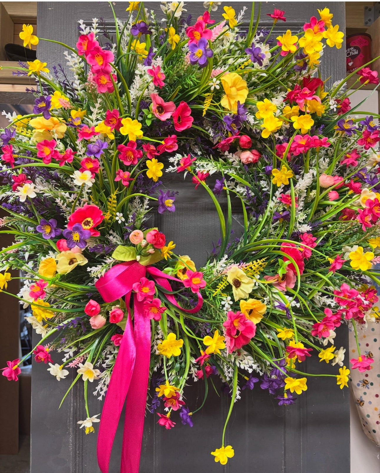 Our ever popular Hello Spring, full of colourful foilage, vibrant flowers and buds… the most amazing wreath for any door entrance