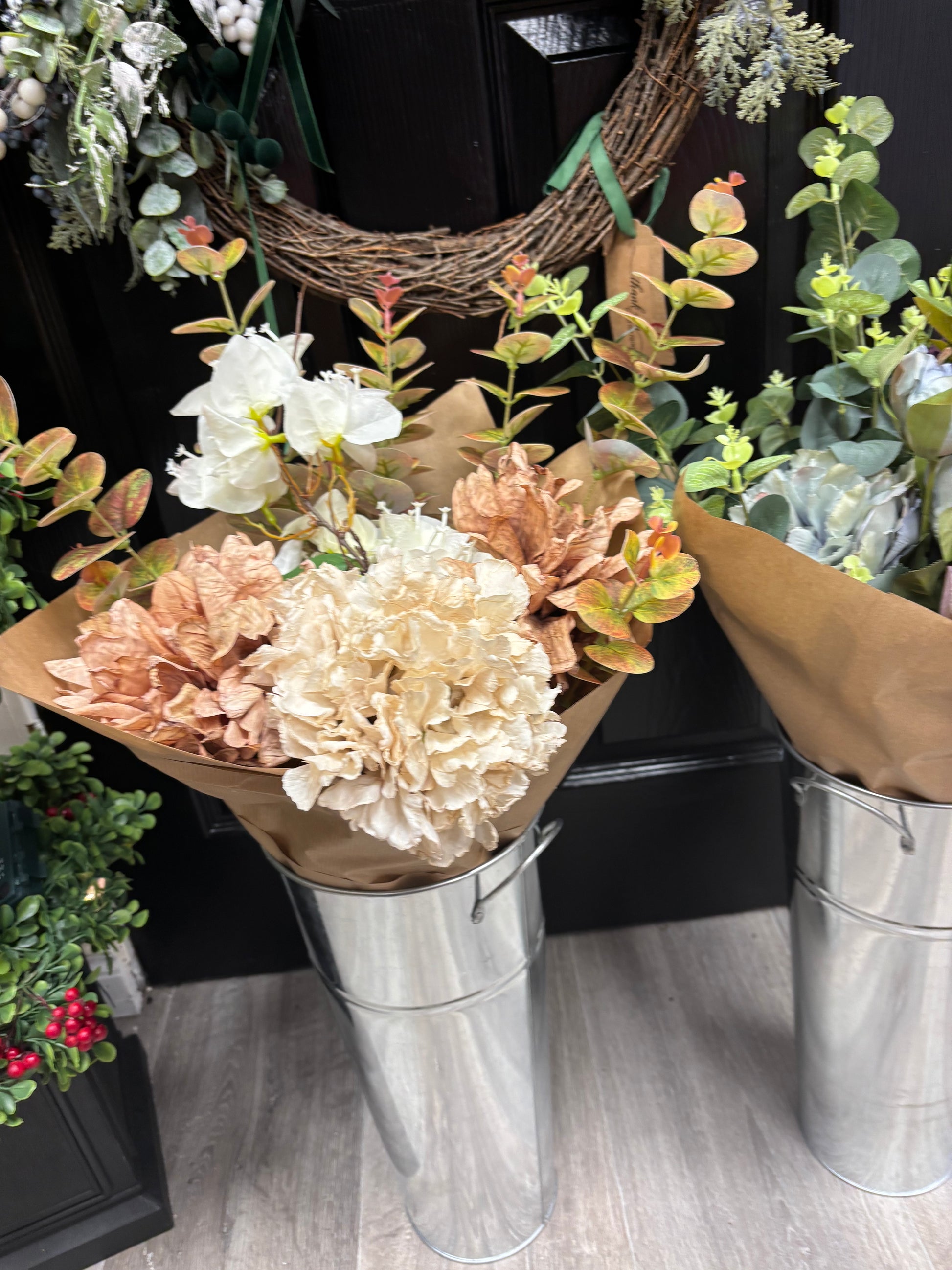 Stunning neutral and floral bouquet, stunning ruffled hydrangea and beautiful coordinated eucalyptus