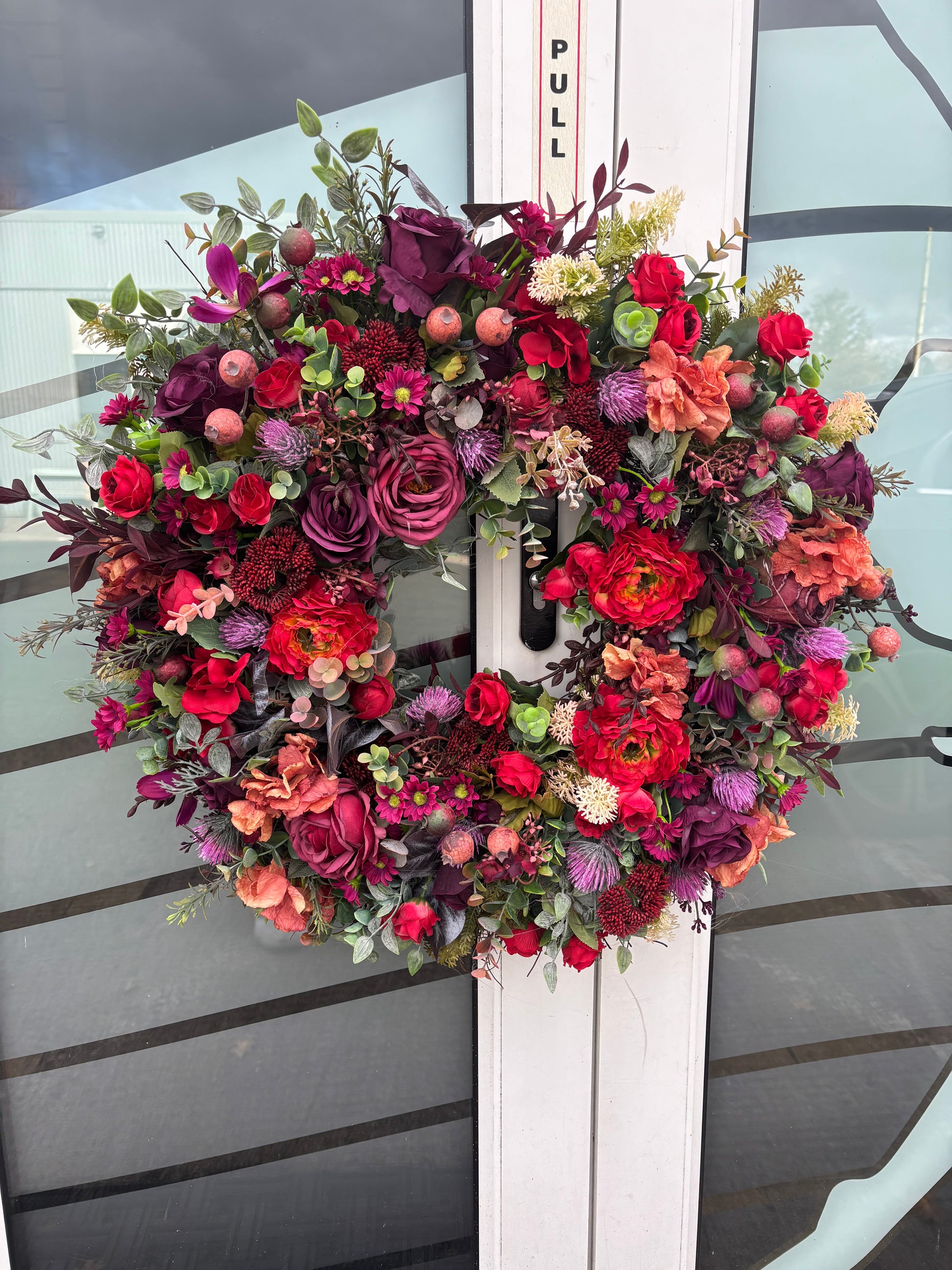 Bring a burst of warmth and colour to your door with our winter Berry & Bloom Wreath. This stunning handcrafted design features a rich medley of deep burgundy roses, vibrant crimson peonies, and rustic orange blooms, perfectly balanced with textured greenery and natural seed pods.
